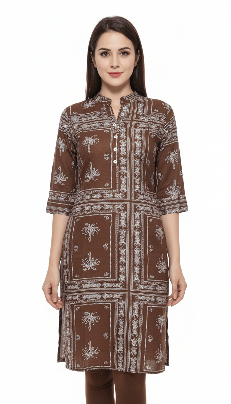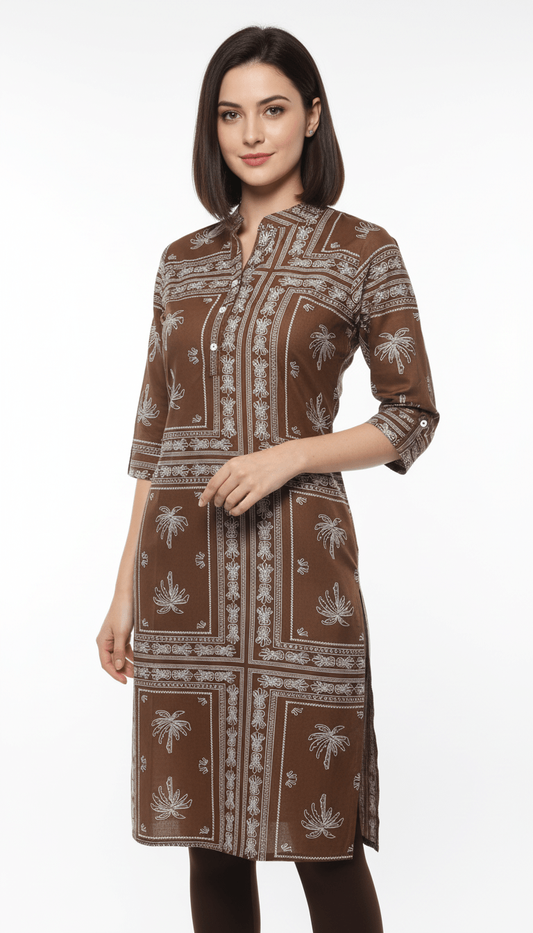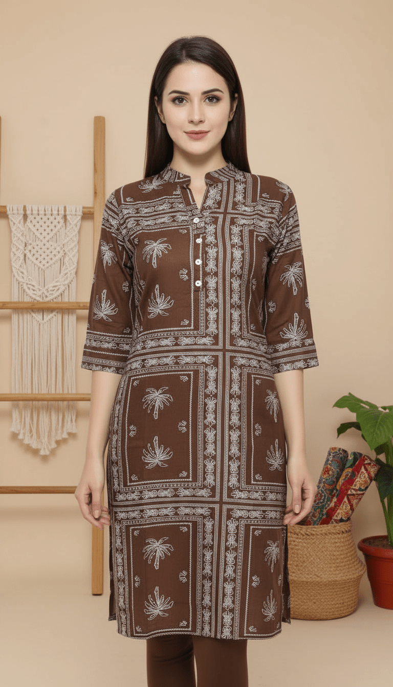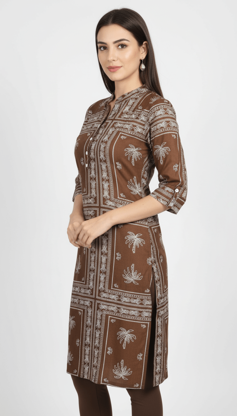 Add effortless elegance to your wardrobe with the Classic Brown Ethnic Kurta, crafted from premium rayon fabric for a smooth, soft, and breathable feel. Designed in a soothing beige shade with delicate leaf prints, this kurta offers a perfect blend of comfort and understated style.