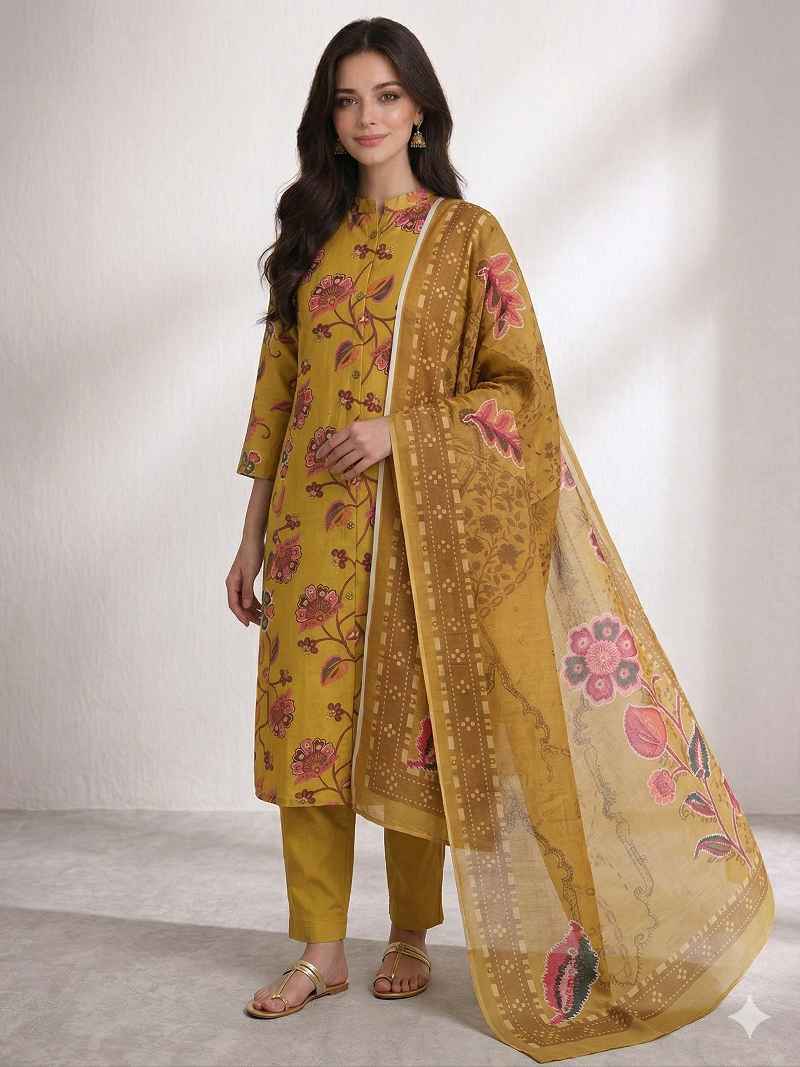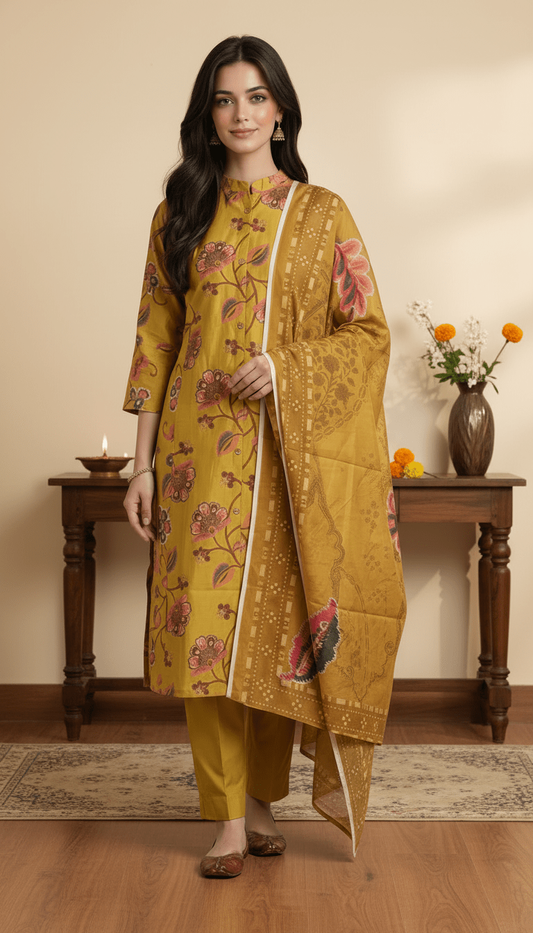 Add a graceful charm to your wardrobe with the Mustard Blossom Chudidhar Set. Designed in a rich mustard shade with delicate floral prints, this outfit brings a warm and elegant look. Crafted from premium Vatican silk, it offers a soft, smooth feel with a refined finish that makes it perfect for festive wear, casual outings, and special day occasions. Paired with a beautifully bordered dupatta, this co-ord set gives a polished and effortlessly stylish appeal.