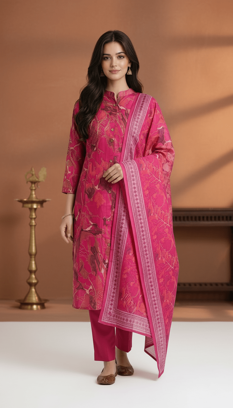 Add a graceful charm to your wardrobe with the Pink Aura Floral Chudidhar Set. Designed in a rich magenta shade with an artistic floral-inspired print, this outfit brings a stylish and elegant look. Crafted from premium Vatican silk, it offers a soft, smooth feel with a refined finish that makes it perfect for festive wear, casual outings, and special day occasions. Paired with a beautifully bordered dupatta, this co-ord set gives a polished and effortlessly stylish appeal.