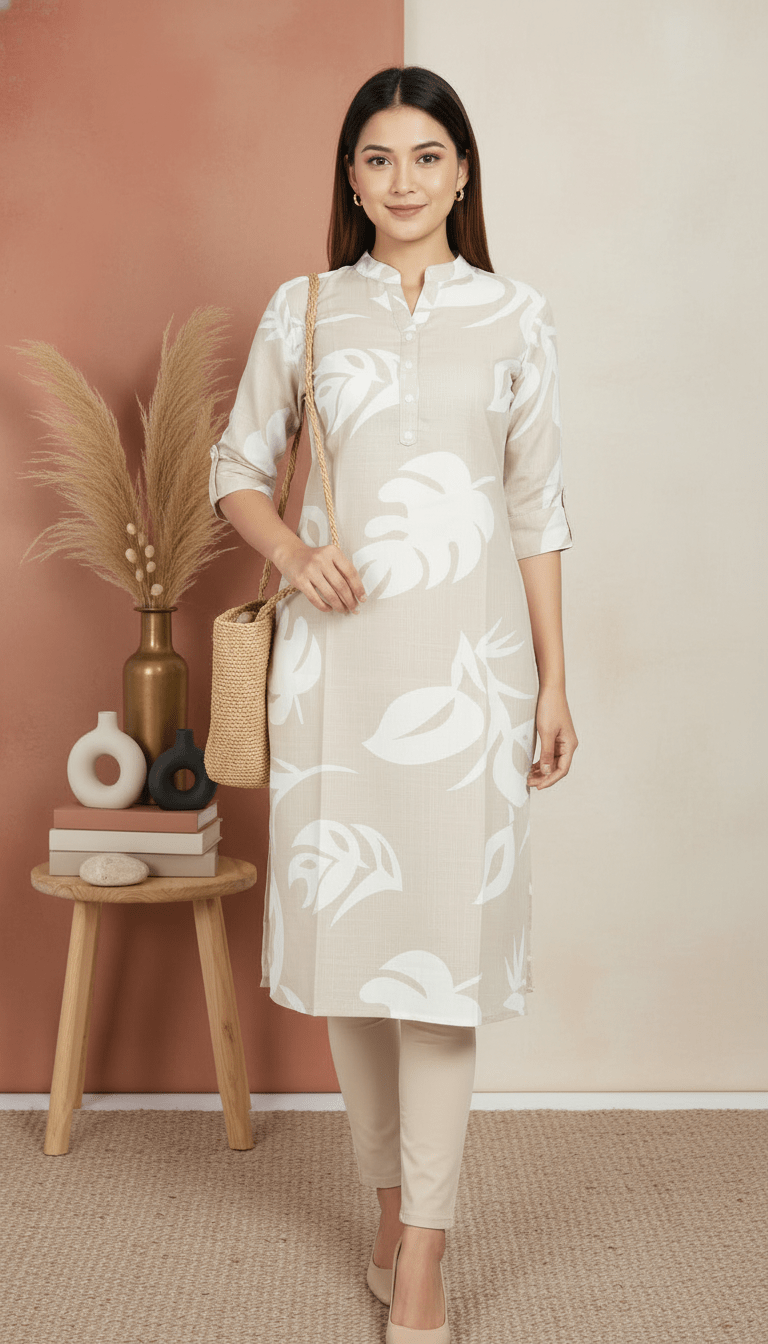 Add effortless elegance to your wardrobe with the Soft Beige Leaf Kurta, crafted from premium rayon fabric for a smooth, soft, and breathable feel. Designed in a soothing beige shade with delicate leaf prints, this kurta offers a perfect blend of comfort and understated style.